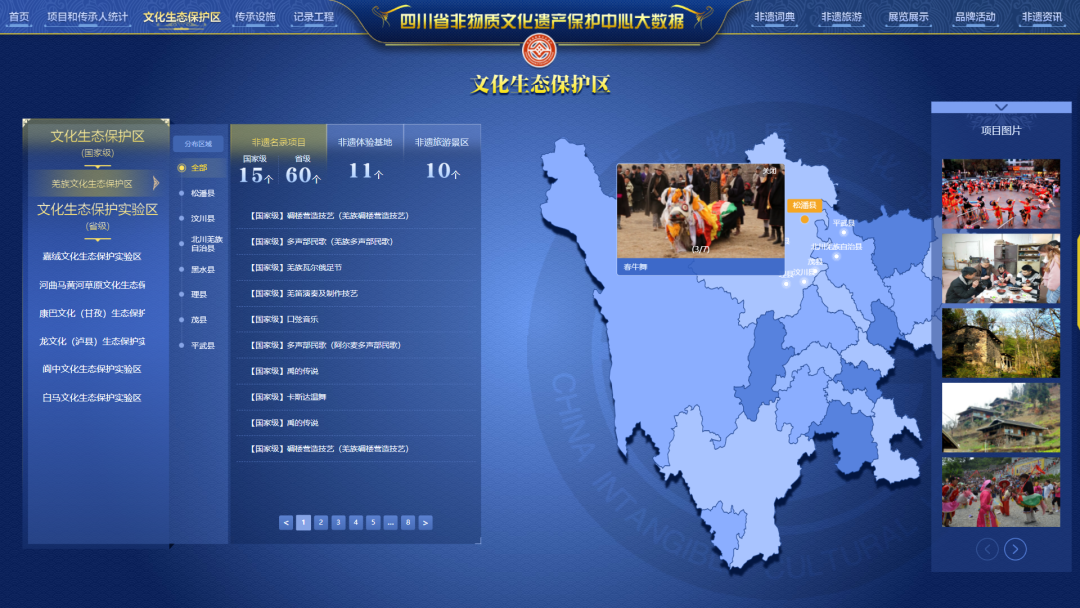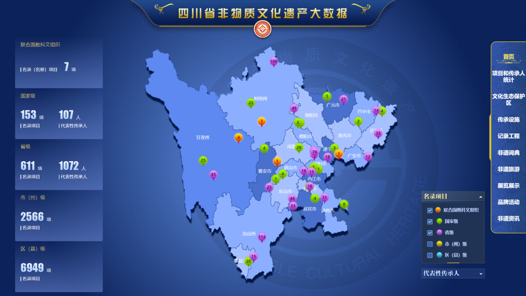 四川省非遺大數(shù)據(jù)平臺(tái)以可視化方式集中展示了四川非遺的圖文影音資源、地域分布、多維度統(tǒng)計(jì)數(shù)據(jù),包括代表性項(xiàng)目、代表性傳承人、傳承設(shè)施等基礎(chǔ)數(shù)據(jù),以及記錄工程、文化生態(tài)保護(hù)區(qū)、非遺詞典、非遺旅游、展覽展示、輿情管理等重要非遺保護(hù)工作成果。