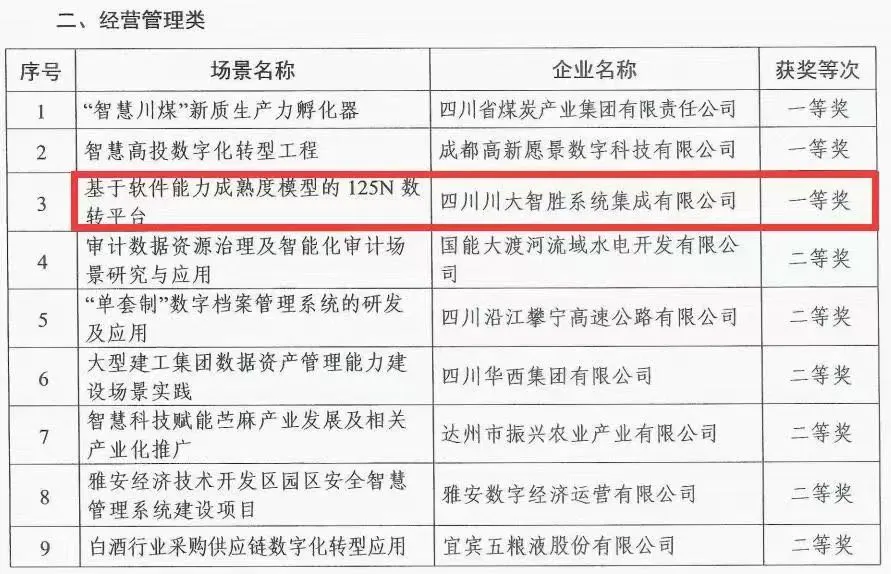此外,川投數科(原簡稱:智勝集成)服務“智改數轉”的熱度正不斷升溫。日前,川投數科(原簡稱:智勝集成)基于軟件能力成熟度模型集成(CMMI)打造的125N(1平臺、2中心、5應用、N場景)數轉平臺獲四川省國資國企數字化轉型優秀場景評選一等獎。